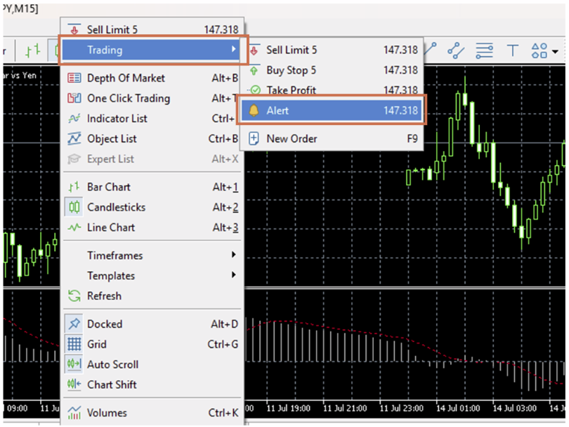 Nhấp chuột phải vào mức giá mong muốn, di chuyển con trỏ đến “Trading”, rồi chọn “Alert”.