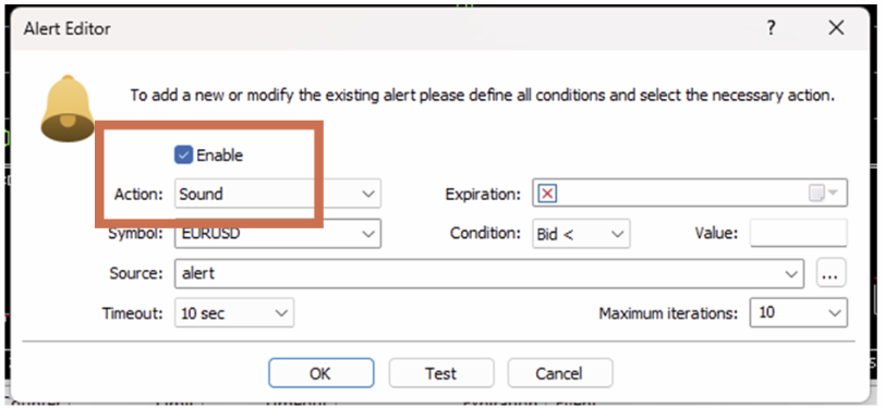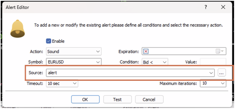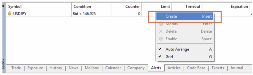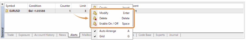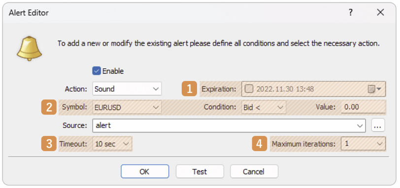 Chỉ định ký hiệu, điều kiện và giá cho cảnh báo. Bid <: Thông báo khi giá Bid của ký hiệu nhỏ hơn giá chỉ định. Bid >: Thông báo khi giá Bid của ký hiệu lớn hơn giá chỉ định. Ask <: Thông báo khi giá Ask của ký hiệu nhỏ hơn giá chỉ định. Ask >: Thông báo khi giá Ask của ký hiệu lớn hơn giá chỉ định. Time =: Thông báo tại thời gian chỉ định. Đặt giá trị theo định dạng “HH:MM”. |