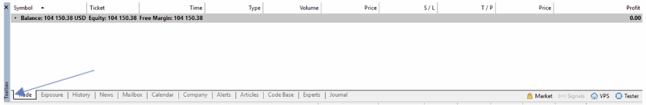 3. Bảng Toolbox sẽ xuất hiện ở phía dưới màn hình MT5 của bạn.