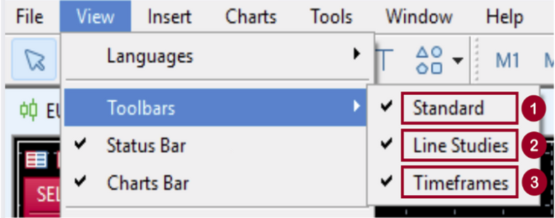 Nhấp chuột phải vào khu vực thanh công cụ, sau đó chọn một trong các tùy chọn: “Standard,” “Line Studies,” hoặc “Timeframes” để bật/tắt hiển thị.