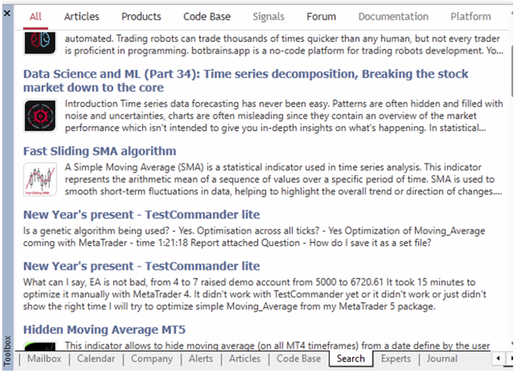 Để mở mục đã tìm thấy, hãy nhấp chuột trái vào tiêu đề của nó. Sử dụng thanh trên cùng để xem kết quả tìm kiếm được tìm thấy trong Sản phẩm Market, Code Base, Tín Hiệu, Diễn đàn MQL5.community và Tài Liệu.
