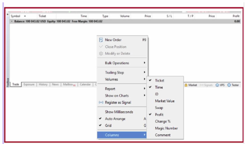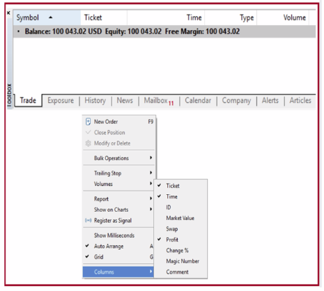 9. Columns: Chọn hiển thị thông tin như ‘Commission’, ‘Profit Change’, ‘Swap’ và các thông tin khác.