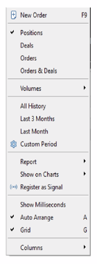 1. Positions/Deals/Orders: Hiển thị giao dịch theo các chế độ khác nhau.