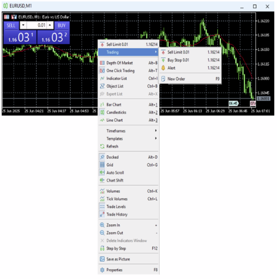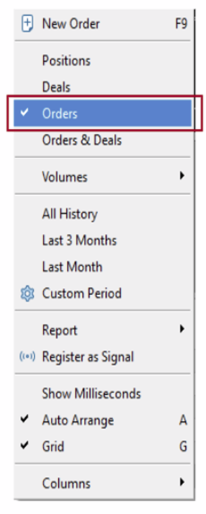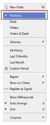 - 1. New Order: Tạo lệnh mới. Khi một vị thế đang hoạt động được chọn, bạn cũng có thể chọn Đóng / Sửa đổi hoặc Xóa lệnh.