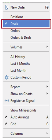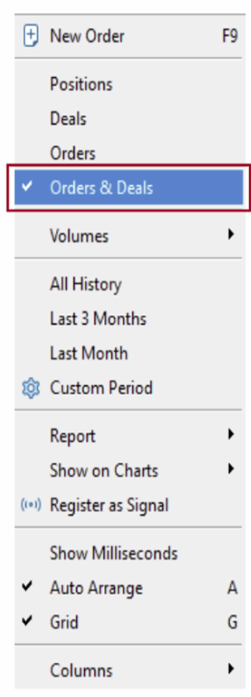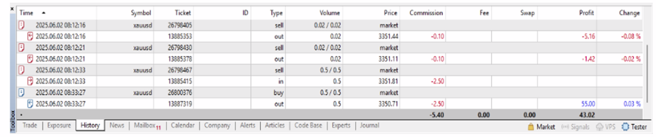 Điều này sẽ hiển thị lịch sử giao dịch tương ứng trong cửa sổ Toolbox.