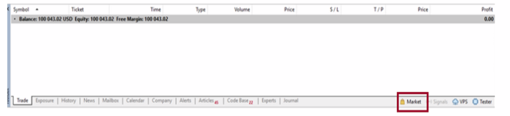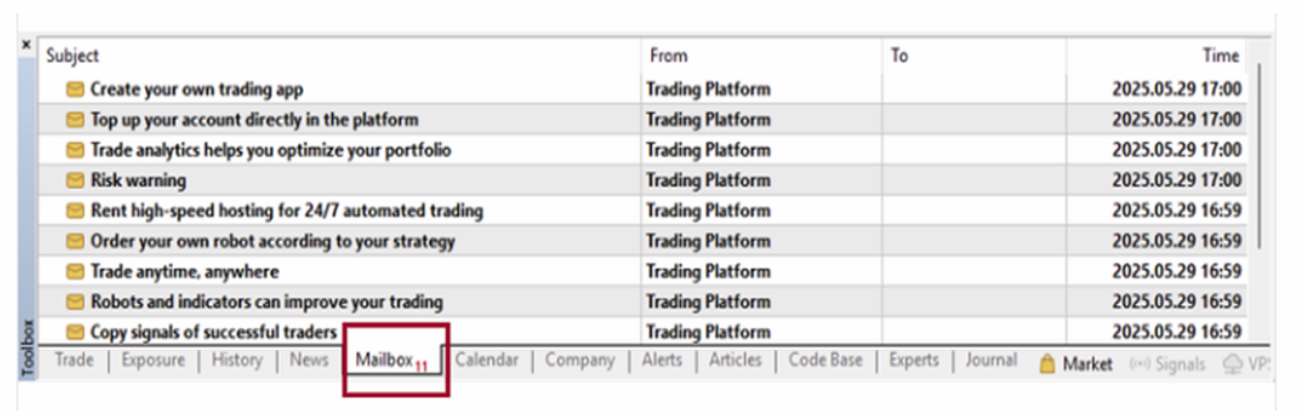 - 5. Mailbox: Truy cập hộp thư MetaTrader5 của bạn từ tab này.