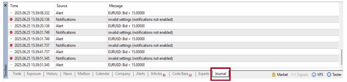 Nếu gặp vấn đề với MT5, bạn có thể xem nhật ký trên tab này để khắc phục.