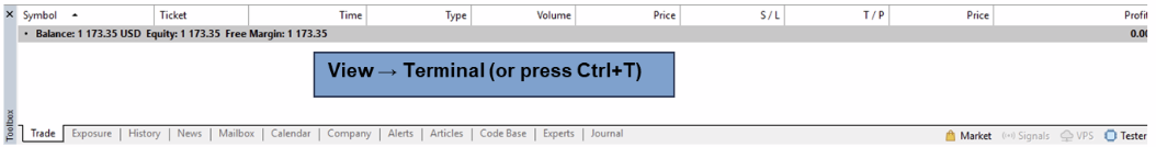 – Panel akan muncul di bagian bawah platform MT5 Anda.