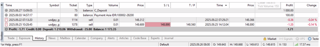 – S/L dan T/P: Stop Loss / Take Profit yang digunakan.
