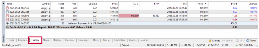 3 Go to the “History” Tab (for Closed Trades)