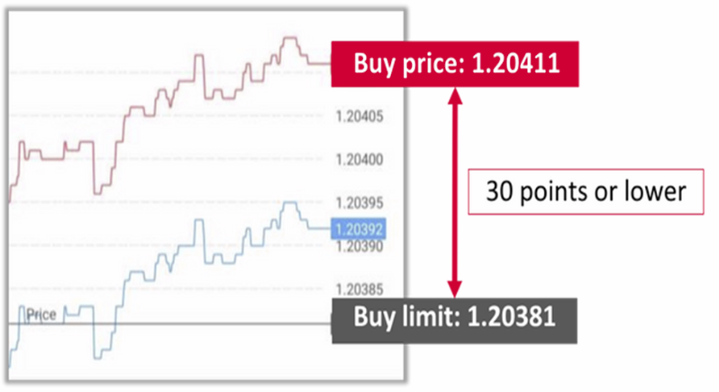 Example: If the current Buy price for EUR/USD is 1.20411, the Buy Limit price should be set at 1.20381 or lower.