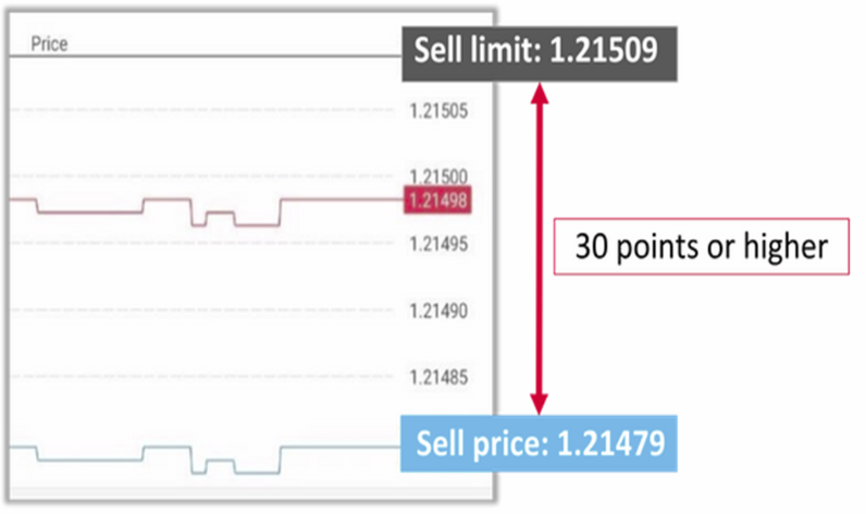 Example: If the current Sell price for EUR/USD is 1.21479, the Sell Limit price should be 1.21509 or higher.