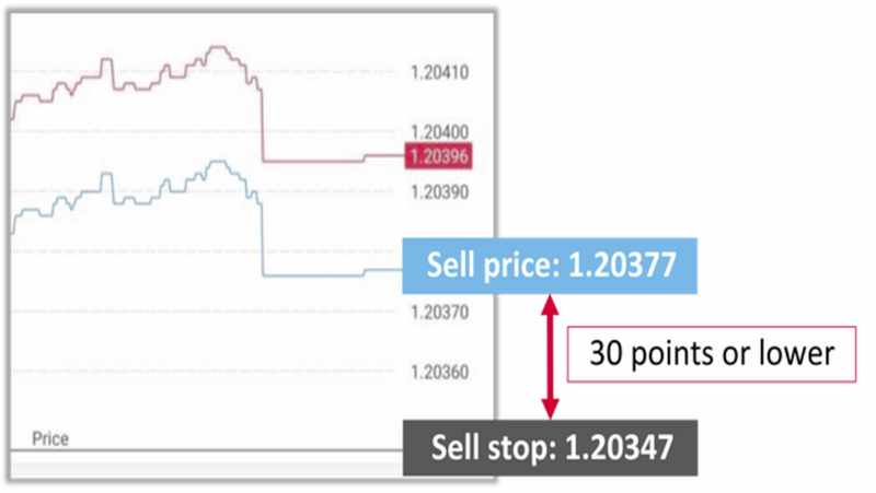 Example: If the current Sell price for EUR/USD is 1.20377, the Sell Stop price should be set at 1.20347 or lower.