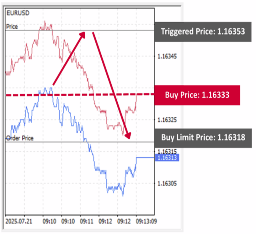 When the price reaches 1.16353, your order becomes a limit order to buy at 1.16318. It will only be executed if the market can fill your order at 1.16318 or lower.