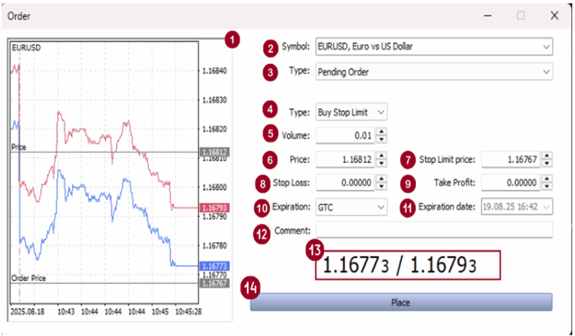 Example: Suppose you place a Buy Stop Limit order with a Stop Price of 1.16353 and a Buy Limit Price of 1.16318.