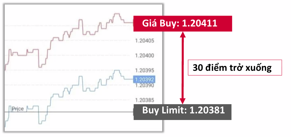 Ví dụ: Nếu giá mua hiện tại của EUR/USD là 1.20411, thì mức giá Buy Limit phải được đặt tại 1.20381 hoặc thấp hơn.