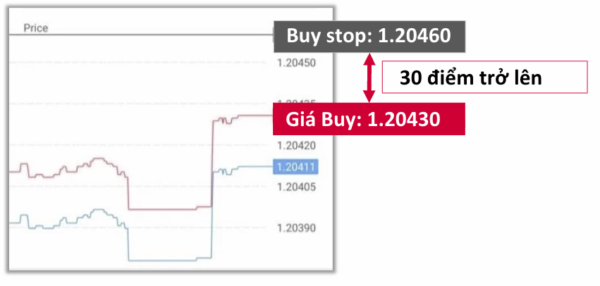 Ví dụ: Nếu giá mua hiện tại của EUR/USD là 1.20430, thì mức giá Buy Stop phải được đặt tại 1.20460 hoặc cao hơn.