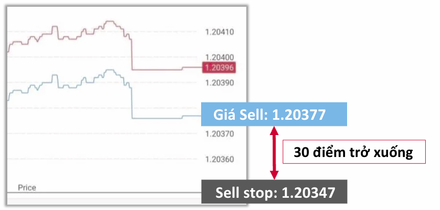 Ví dụ: Nếu giá bán hiện tại của EUR/USD là 1.20377, thì mức giá Sell Stop phải được đặt tại 1.20347 hoặc thấp hơn.