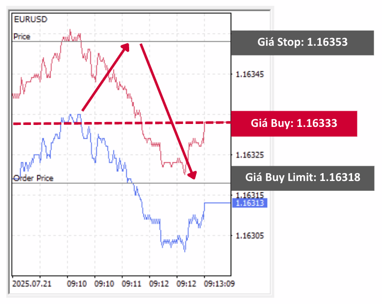 Ví dụ: Giả sử bạn đặt Buy Stop Limit với giá Stop là 1.16353 và giá Buy Limit là 1.16318.
