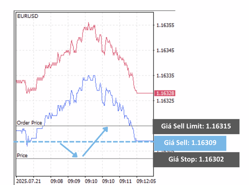 Ví dụ: Giả sử bạn đặt Sell Stop Limit với giá Stop là 1.16302 và giá Sell Limit là 1.16315.