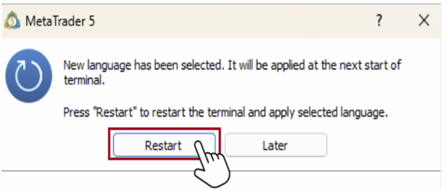 Nhấp vào nút “Restart” trong hộp thoại, và MT5 sẽ tự động khởi động lại với ngôn ngữ bạn đã chọn. Nếu bạn muốn khởi động lại sau, nhấp vào nút “Later”.