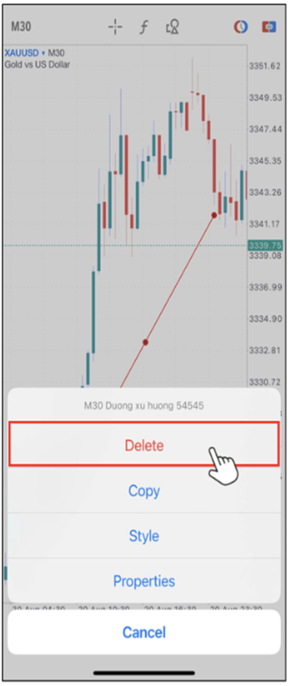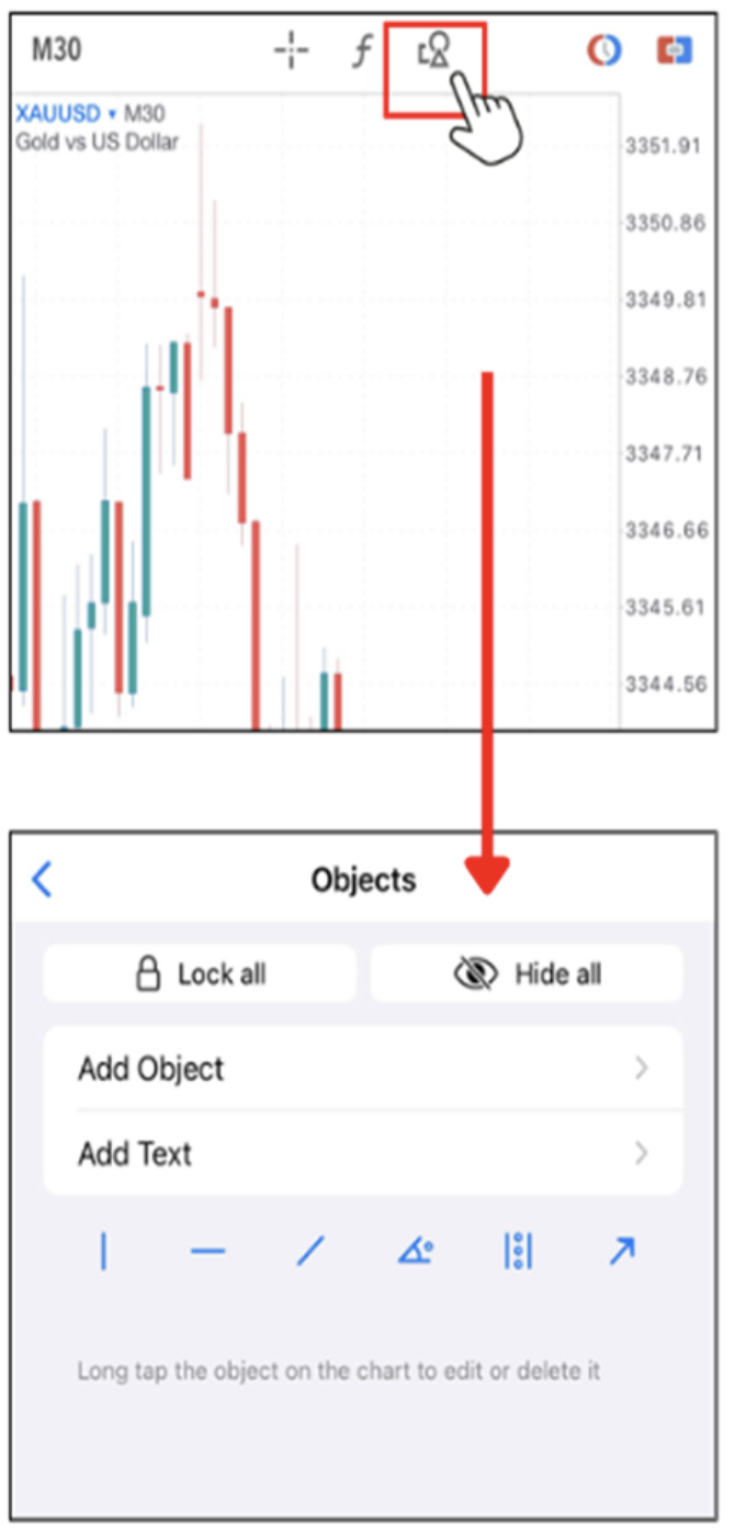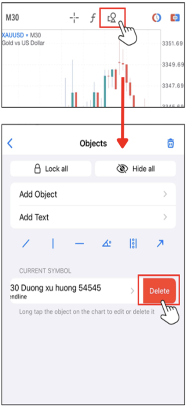 To delete objects such as lines, tap the Objects icon at the top left of the screen, or tap on the chart and select Objects from the menu that appears.
