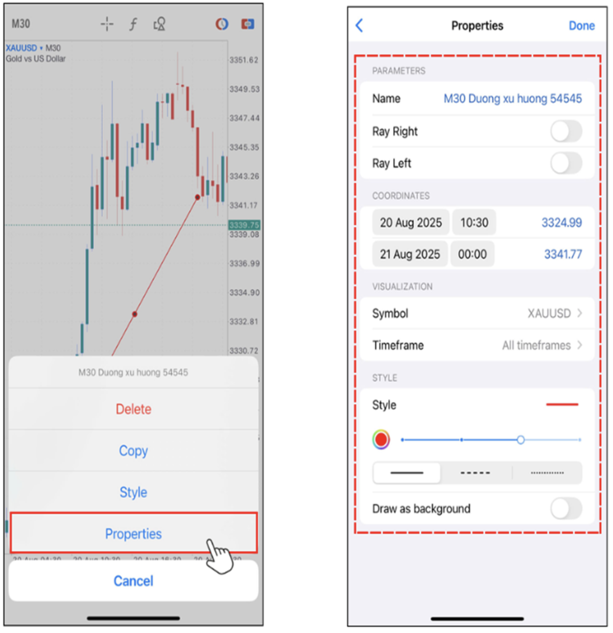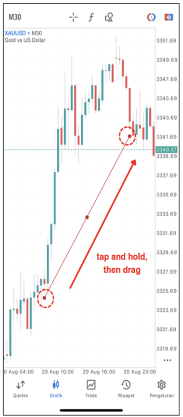 For trendlines and similar objects, tap at the starting point on the chart and drag to the desired endpoint to draw.