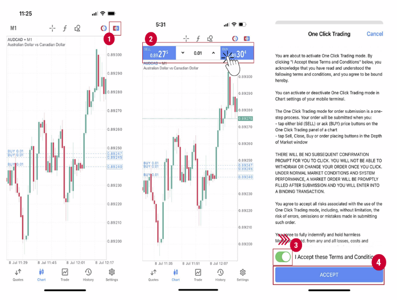 (1) On Chart Screen, tap the One-Click Trading button on the top right of the screen