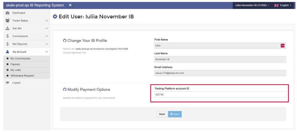 - 2. Simpan ID akun platform perdagangan ke kolom di bagian ‘Modify Payment Options’