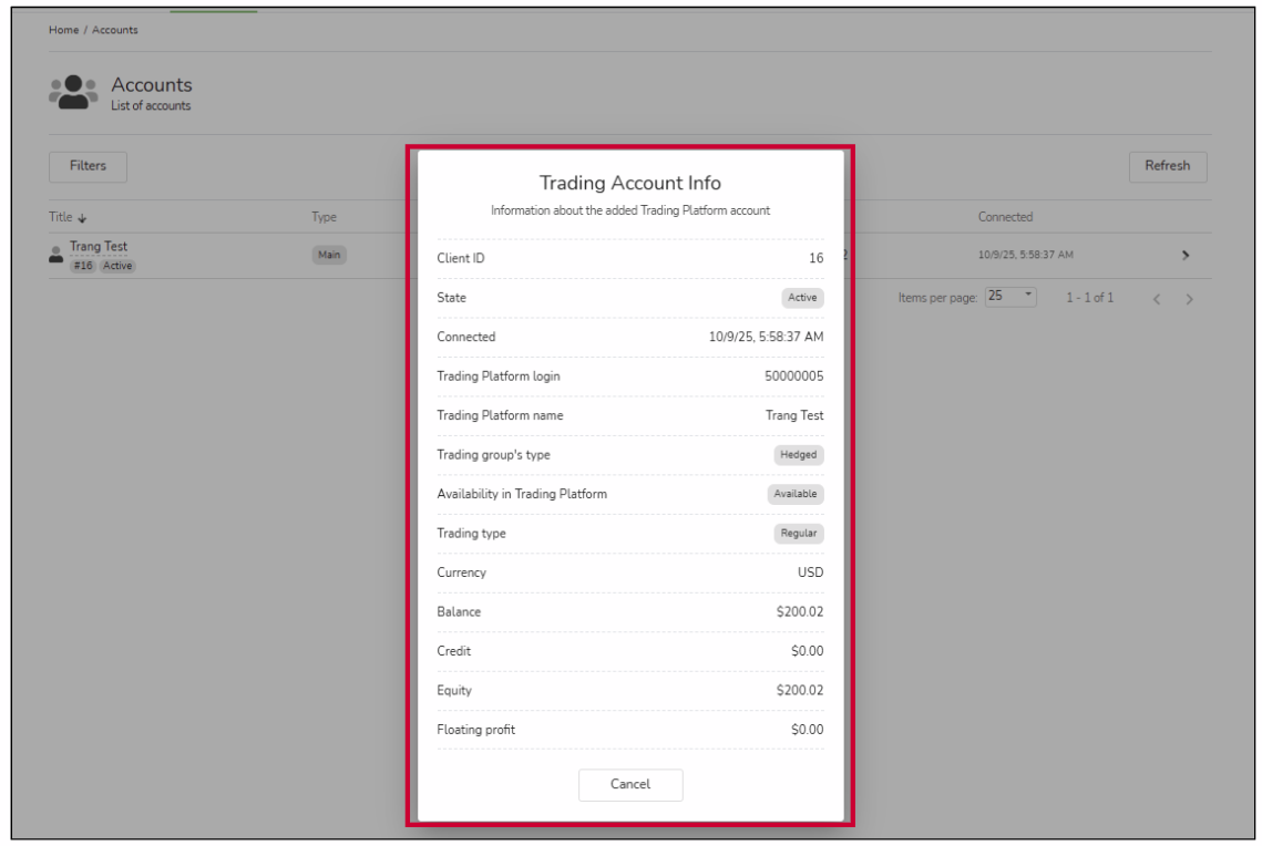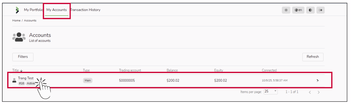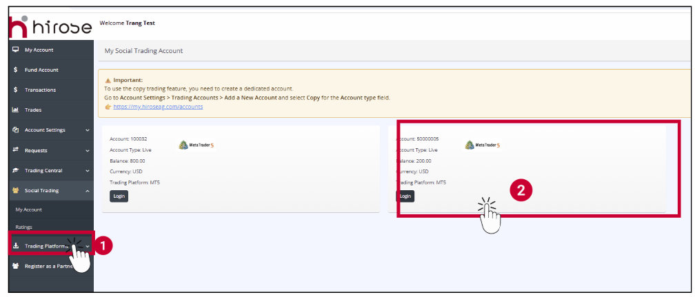 4 Position/ Deals/ Fees When viewing a copy position, you’ll see details including Position, Source, Status, Open Time, Volume, Profit, Close Time, and Performance Fee.